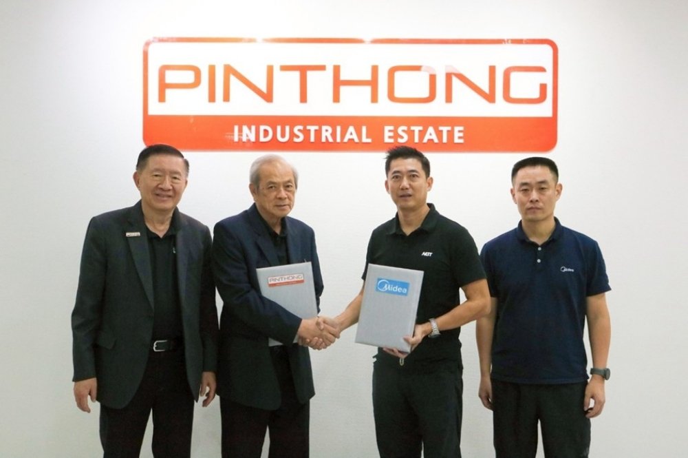 เมื่อเร็วๆ นี้ นายสุจินต์ เรียนวิริยะกิจ (ที่ 2 จากซ้าย) กรรมการบริษัท และ นายสุรัช พัฒนวงศ์ยืนยง (ที่ 1 จากซ้าย) กรรมการบริหาร บริษัท ปิ่นทอง อินดัสเตรียล ปาร์ค จำกัด (มหาชน) หรือ PIN ร่วมลงนามในสัญญาซื้อขายที่ดินผืนใหญ่ขนาด 80 ไร่ (128,000 ตารางเมตร) ในนิคมอุตสาหกรรมปิ่นทอง 6 จังหวัดระยอง กับ นายฮ่าน หลิน (ที่ 3 จากซ้าย) ผู้จัดการทั่วไปประจำโรงงานประเทศไทย บริษัท ไมเดีย อินเทลลิเจนท์ แมนูแฟคเจอริ่ง (ประเทศไทย) จำกัด ในเครือ Midea Group ผู้นำเทคโนโลยีเครื่องใช้ไฟฟ้าอัจฉริยะระดับโลกจากจีน โดยการลงนามในครั้งนี้ มีเป้าหมายสำคัญเพื่อให้ไทยเป็นฐานการขยายการผลิตระบบปรับอากาศและระบายอากาศ (HVAC) รวมถึงเครื่องปรับอากาศเชิงพาณิชย์ ภายใต้กลุ่มธุรกิจ Midea Building Solutions ซึ่งครอบคลุมนวัตกรรมการจัดการอาคารครบวงจร อาทิ ระบบทำความเย็นขนาดใหญ่ (Chiller), โซลูชันอาคารอัจฉริยะ (Smart Building) และเทคโนโลยีประหยัดพลังงาน รองรับโครงการขนาดใหญ่ เช่น ศูนย์การค้า โรงพยาบาล อาคารสำนักงานชั้นนำ และโครงการพัฒนาอสังหาริมทรัพย์ขนาดใหญ่ต่างๆ